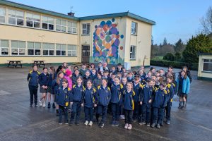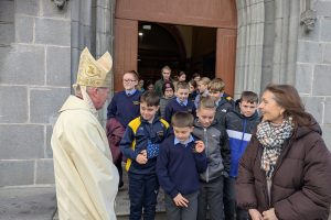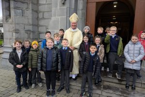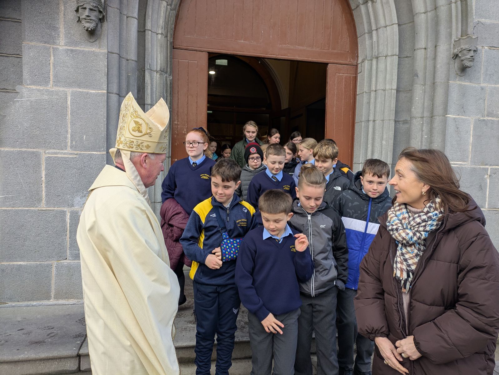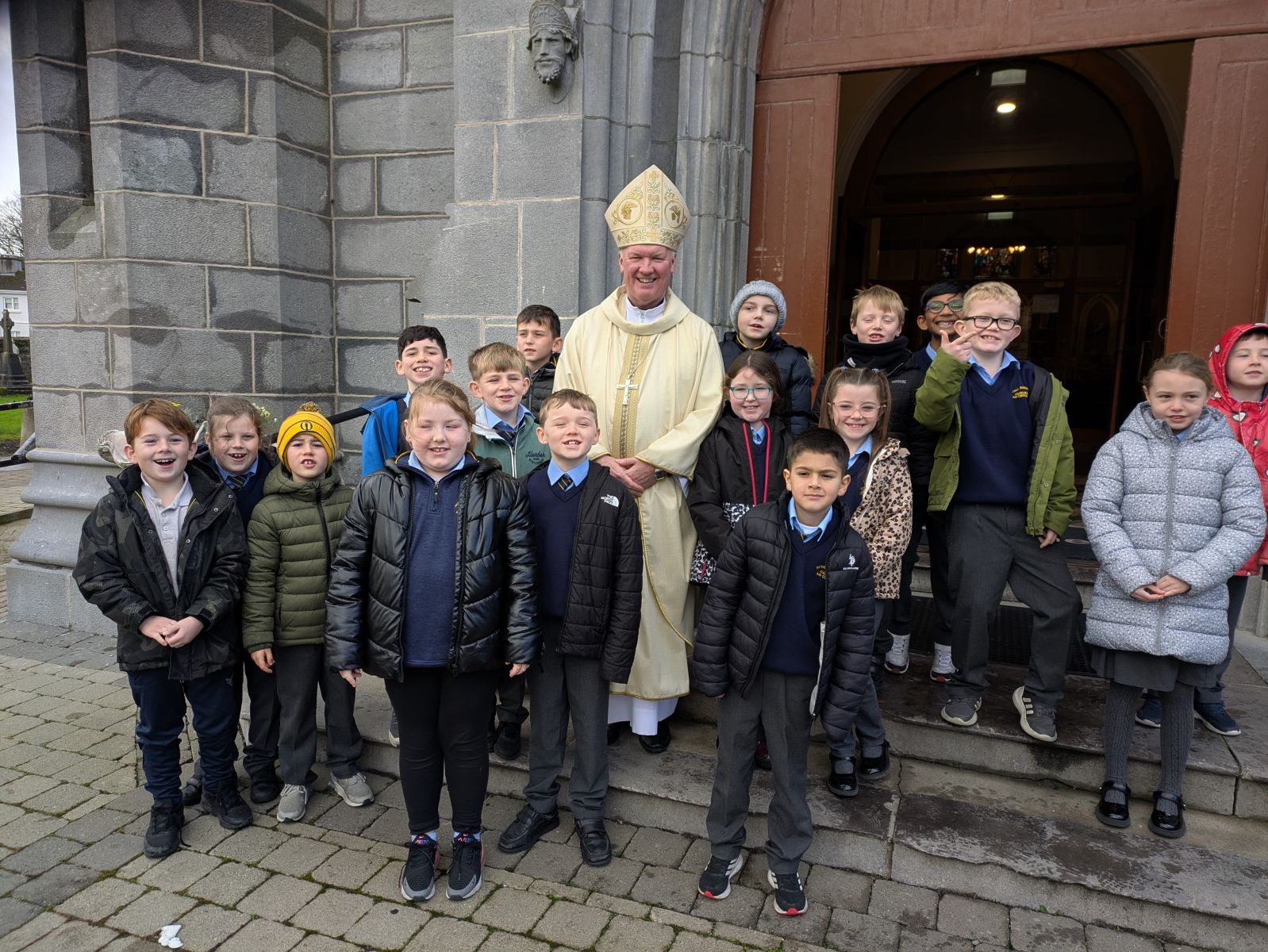 Many thanks to Bishop Coll who celebrated our Mass on the Feast of the Immaculate Conception. Joined by the boys and girls of Scoil Íosagáin it was a lovely celebration which marked the feast day of our Church and the new chapter of education in our parish. Well done to all who lead the prayers, sang their hearts out and brought water which was used to bless the school. After Mass Bishop Coll was accompanied by the boys and girls of sixth class to the school where we had a short assembly outdoors when Bishop Coll prayed a prayer of dedication and blessing of the school. Pupils from sixth class brought Bishop Coll around to each classroom to greet each class group and bless each room.